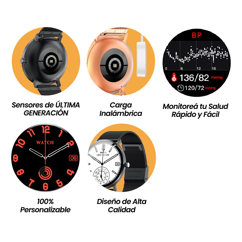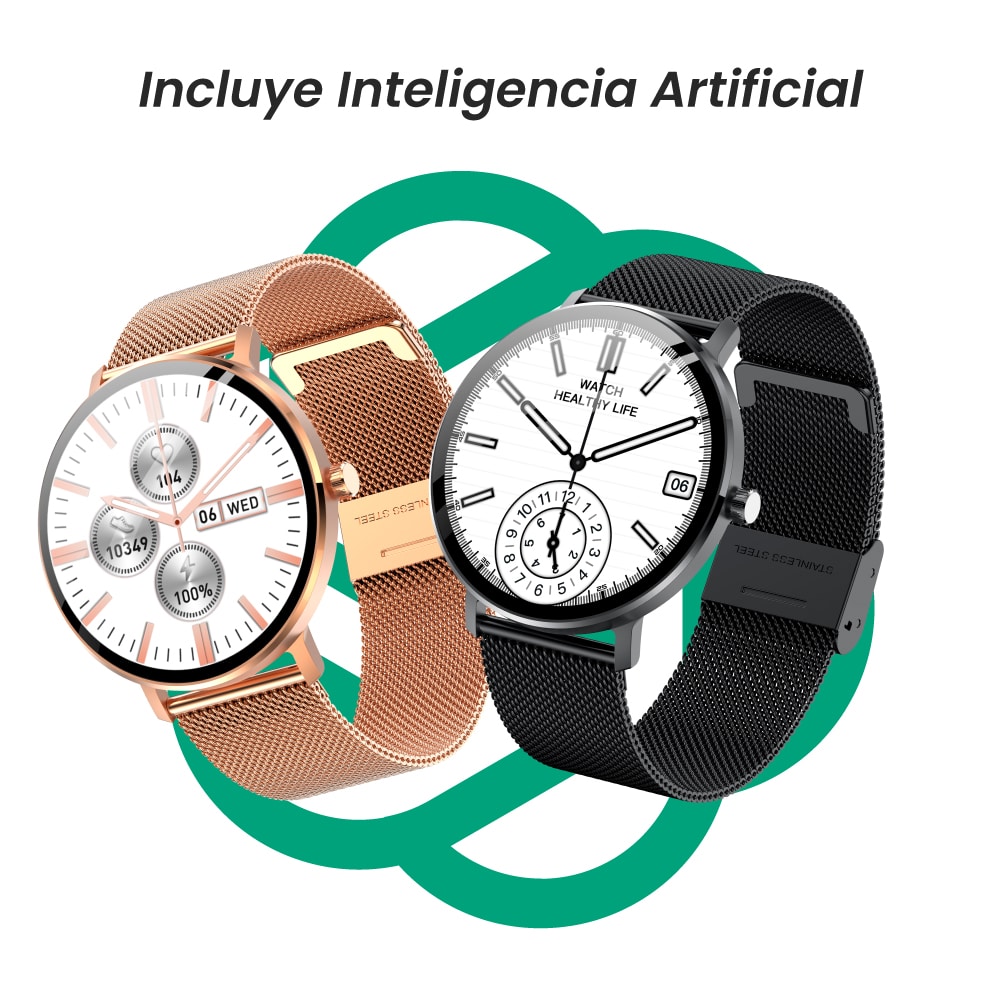 Reloj inteligente de grandes prestaciones, se pueden realizar llamadas telefonicas, recibir mensajes de whatsapp, redes sociales. Tiene sistema multideporte: medición de calorías y latidos por minuto, temperatura corporal, cantidad de pasos, distancia recorrida, presion arterial, etc. Descarga gratuita de más de 500 fondos de pantalla, efectos de acercamiento y alejamiento de desplazamiento de lista hacia arriba y hacia abajo, conexión con un clic, juegos somatosensoriales, GPS deportivo, descargas de juegos, administración de fondo, función cambio de fondo de la aplicación, video de trayectoria deportiva en la aplicación, intercambio de salud familiar y posicionamiento de información de salud, alarma de emergencia SOS, control de acceso NFC álbumes de fondos de pantalla, videos de fondos de pantalla, llamada Bluetooth, asistente de voz, tono de llamada independiente, reloj independiente, pantalla siempre encendida, luz de noche, fisiología femenina, temperatura corporal, frecuencia cardíaca y electrocardiograma, presión arterial, oxigenación en sangre, monitoreo de sueño, conteo de pasos, cámara Bluetooth, música Bluetooth, amigos, código de pago, calculadora, agenda telefónica, clima, cronómetro, temporizador, alarma, PIN de bloqueo, linterna.